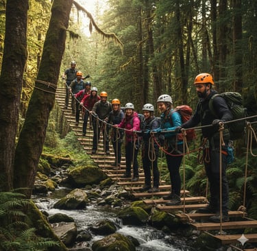 Liderazgo Situacional: El líder no es una persona fija, sino aquel que tiene la habilidad o el conocimiento para el tramo que se va a cruzar. En un momento, el más fuerte y seguro es el líder al asegurar los anclajes; al siguiente, el más ligero y ágil es el líder al probar la estabilidad del puente.