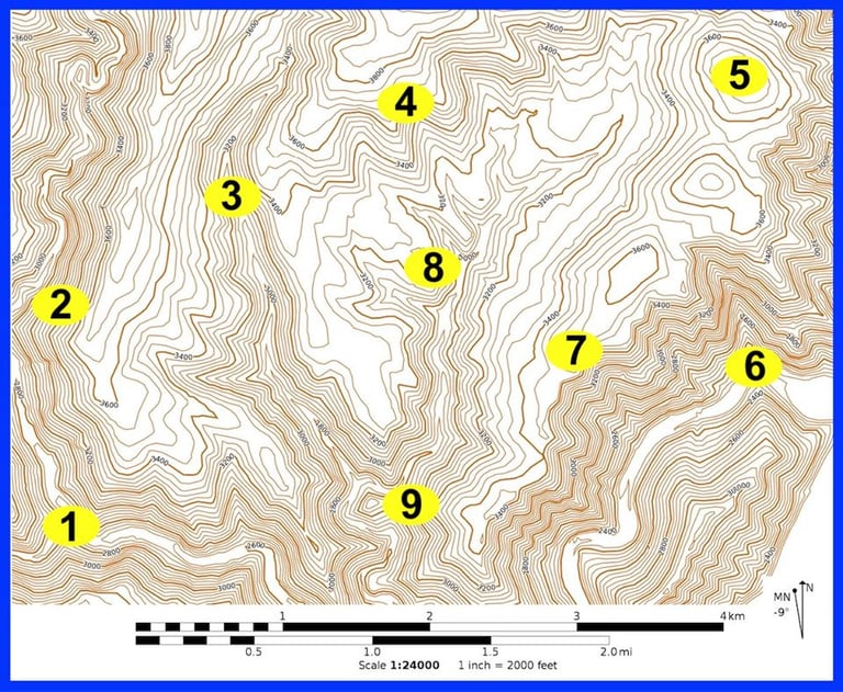 El primer paso es conseguir un mapa. Si solo planeas recorrer senderos bien establecidos en un parque, un mapa básico de senderos es todo lo que necesitas. Sin embargo, si viajas fuera de carretera o senderos, deberías tener un mapa topográfico. Un mapa topográfico muestra las características físicas del terreno, especialmente su forma y elevación, como se muestra a continuación.